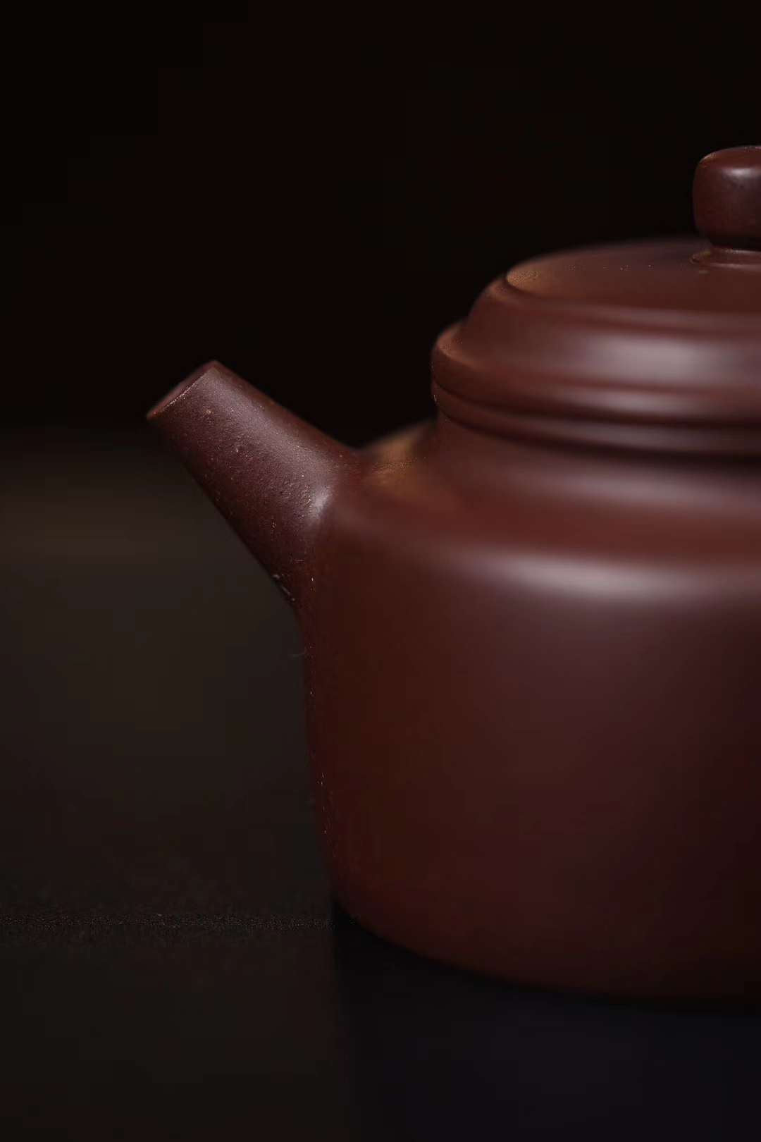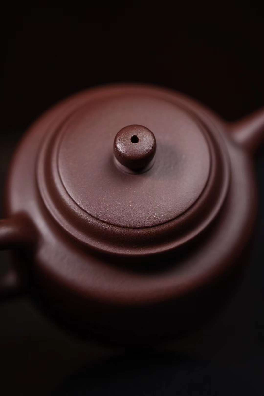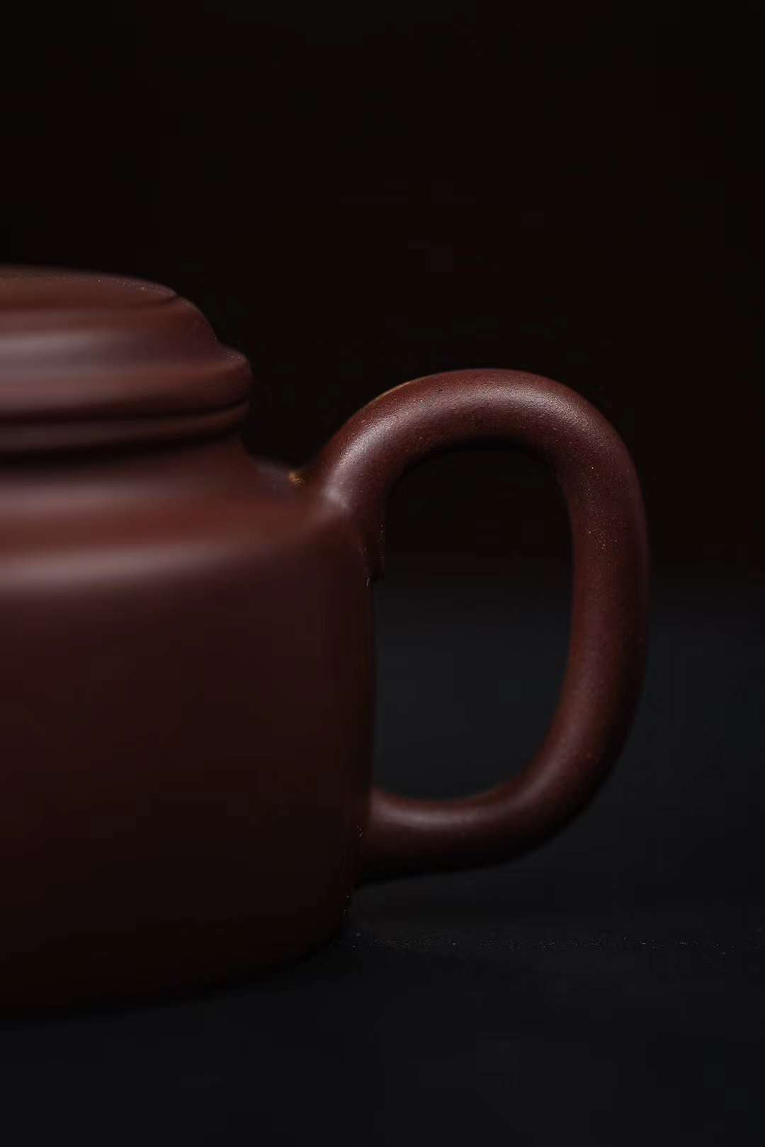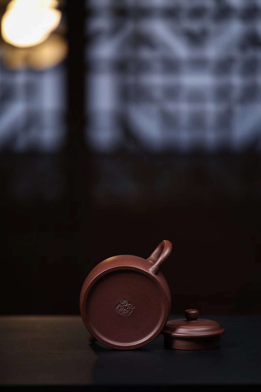 紫砂一厂老艺人周良华老师手制,壶口之上下圆线,像双唇轻抿,平和端庄、神态自若,不仅壶型周正,更有一种正直的气势蕴含其中。
