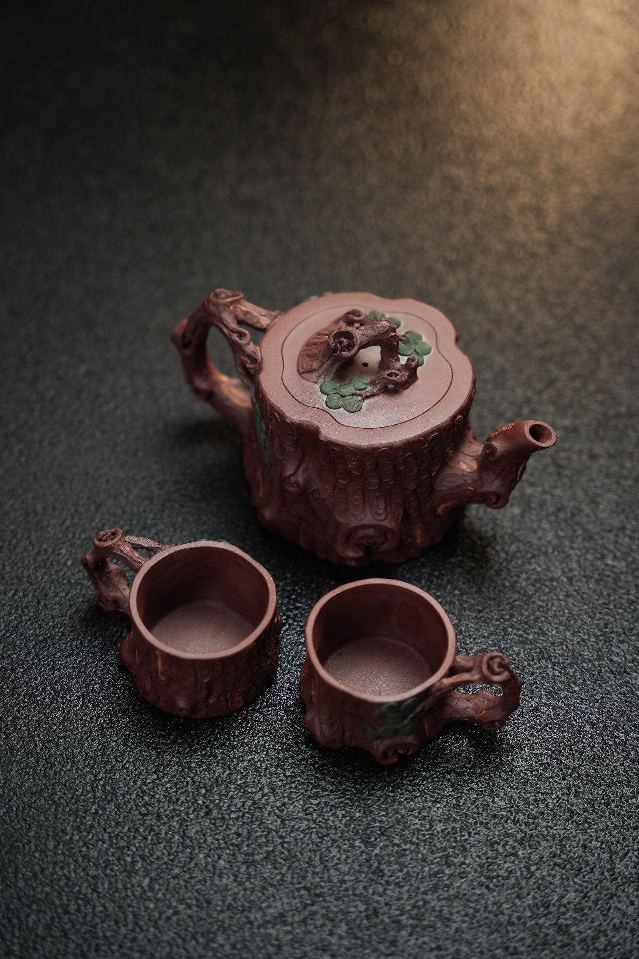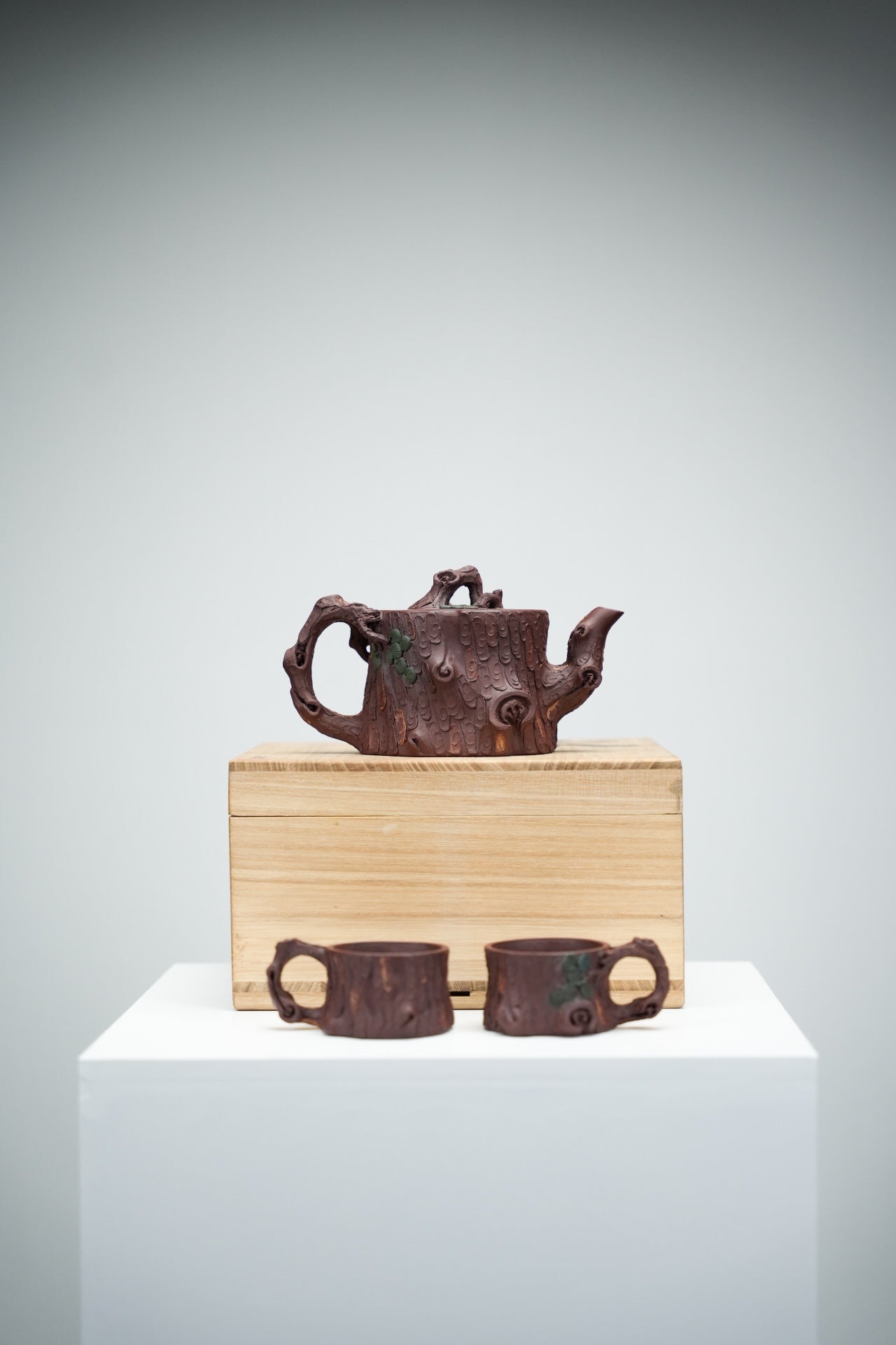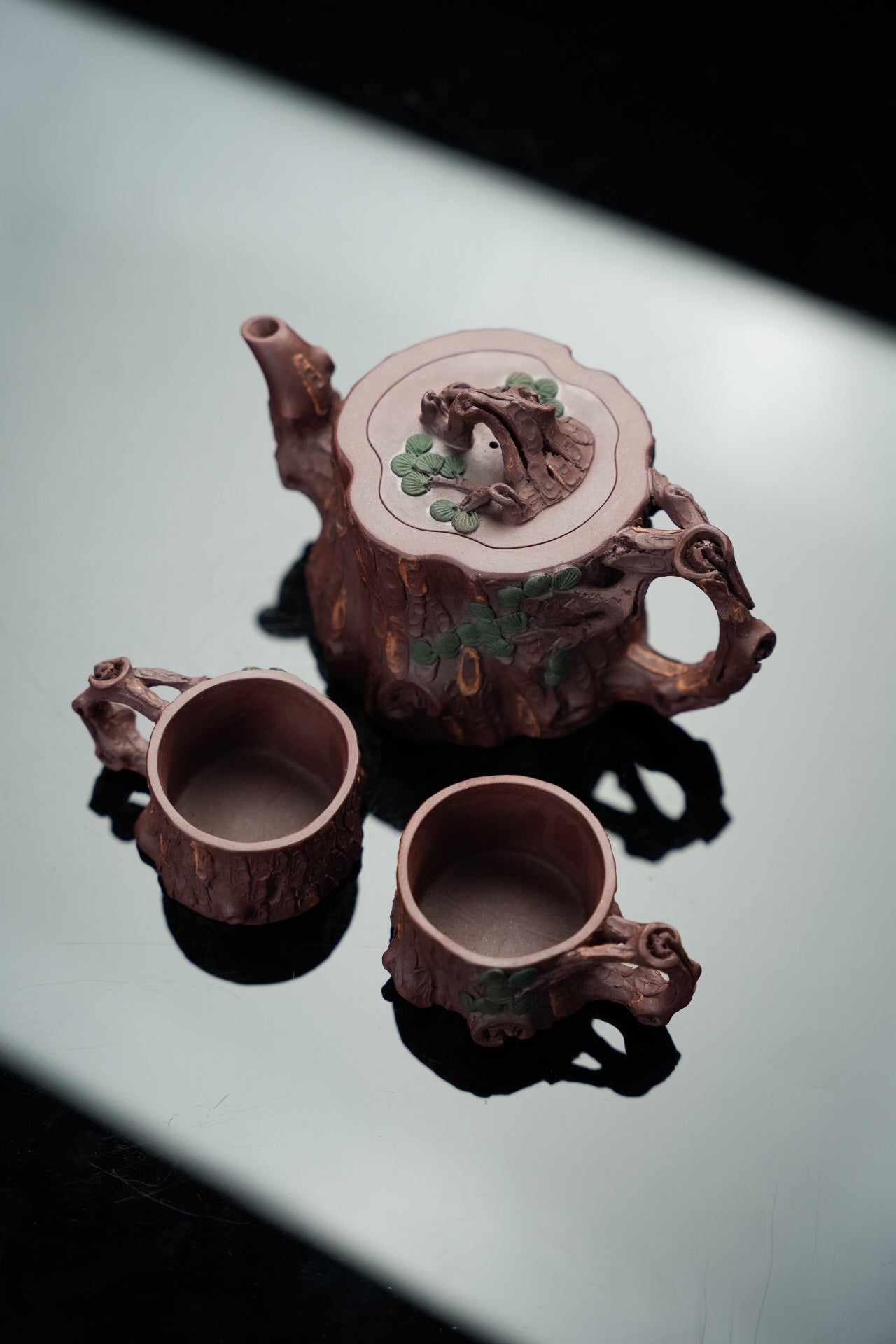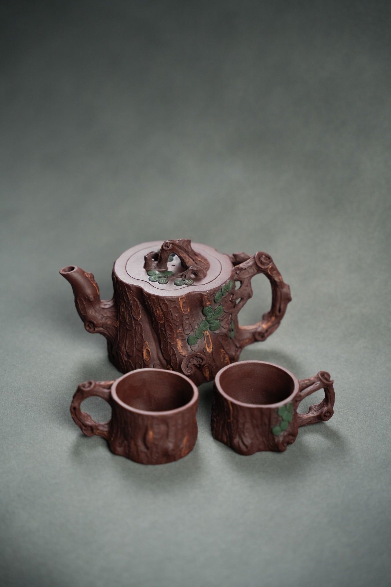 松桩套组·慕古·壶杯300/50cc 原矿优质紫泥 慕古润泽 以松树桩为形 树皮贴花更显工艺 嘴 钮 把 形体非常好 苍劲有力 非常灵动 有勃勃生机之感 斑驳嶙峋枝干 树瘿刻划精细入微 整体形态 庄重大气环境