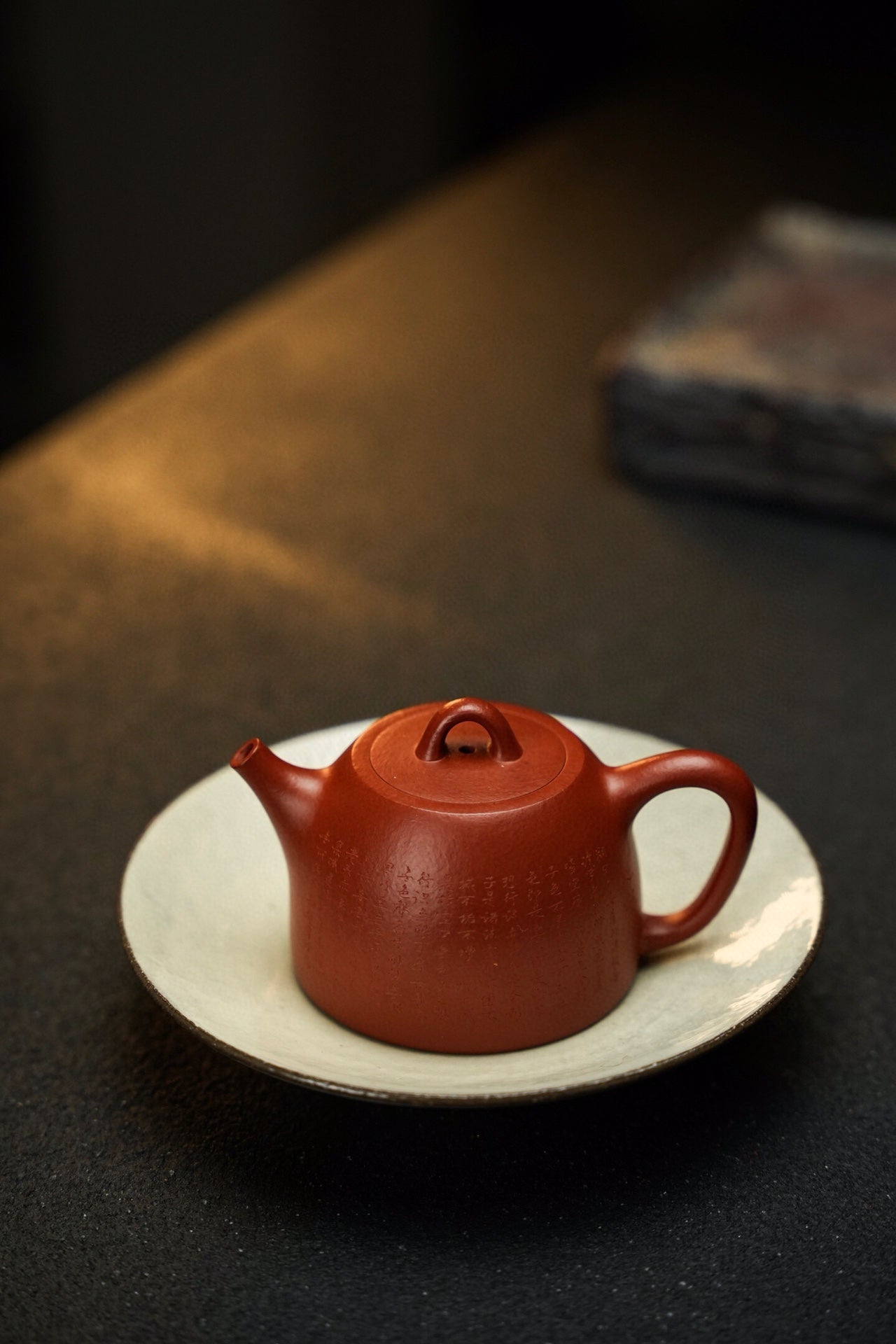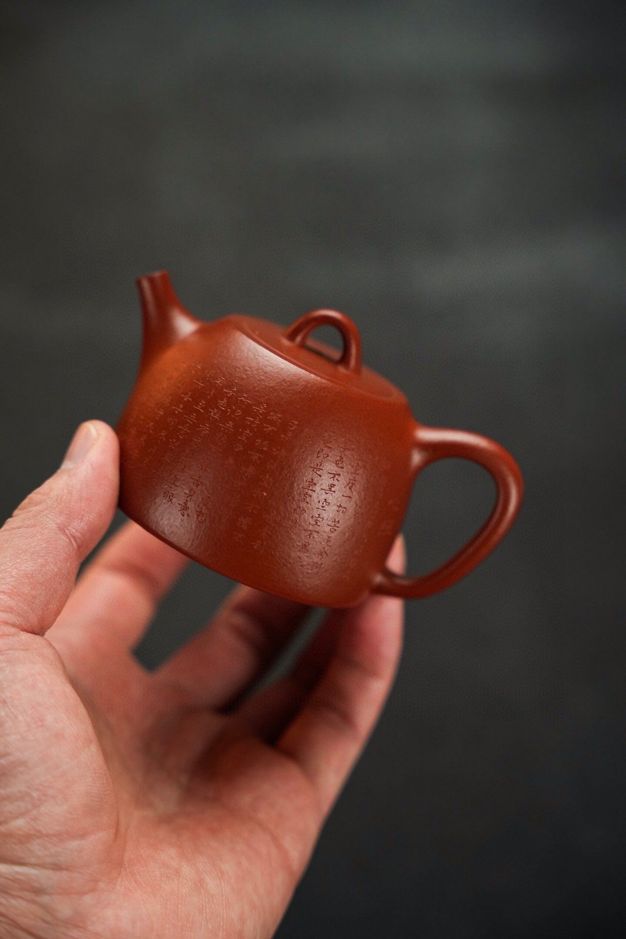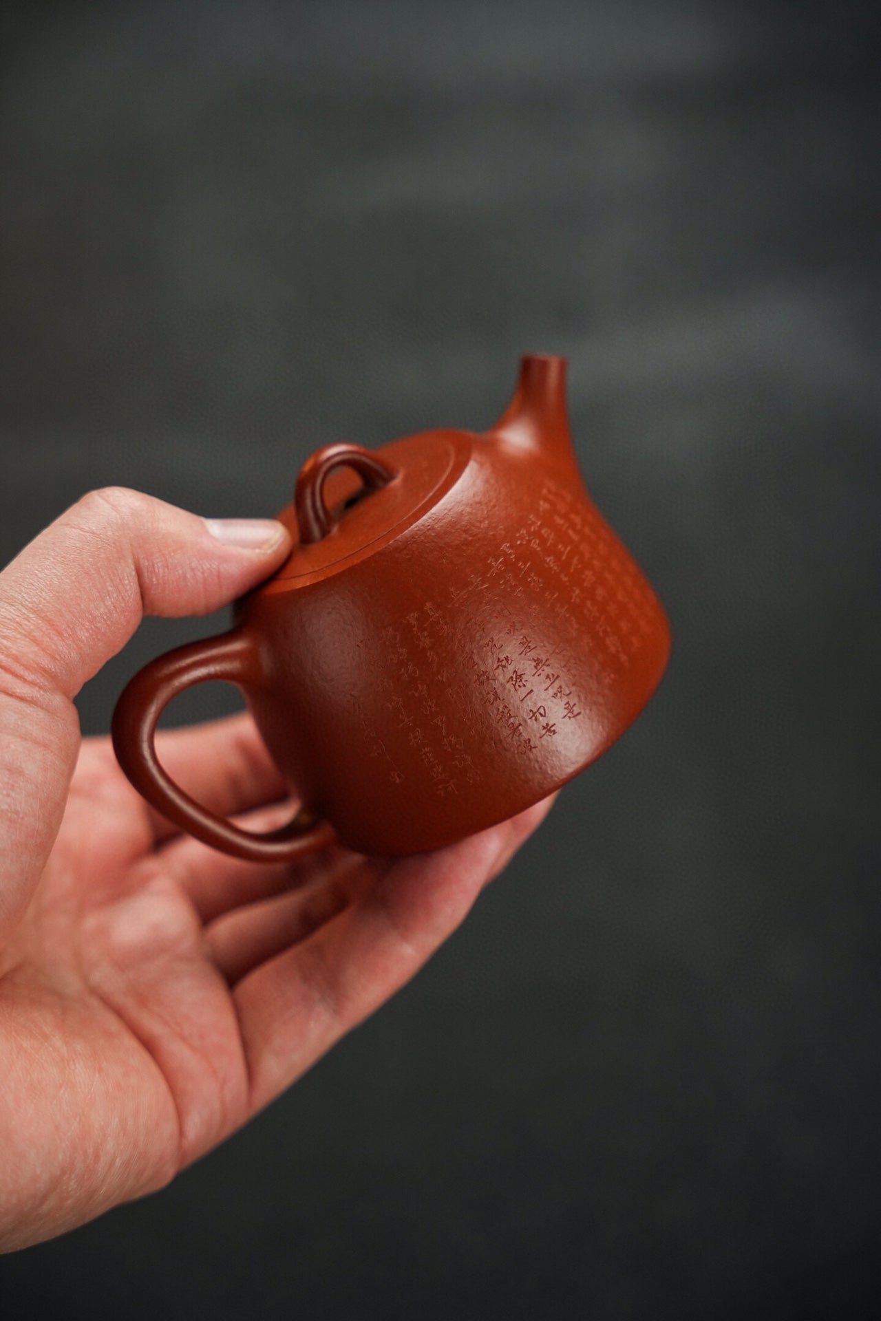 玉成汉铎·全手工·130cc 原矿30目粗砂朱泥 泥色油润 砂感丰富 上手效果好 堪堪一握 慕:玉成窑式汉铎 手工微刻心经优雅灵动 直嘴出水爽利