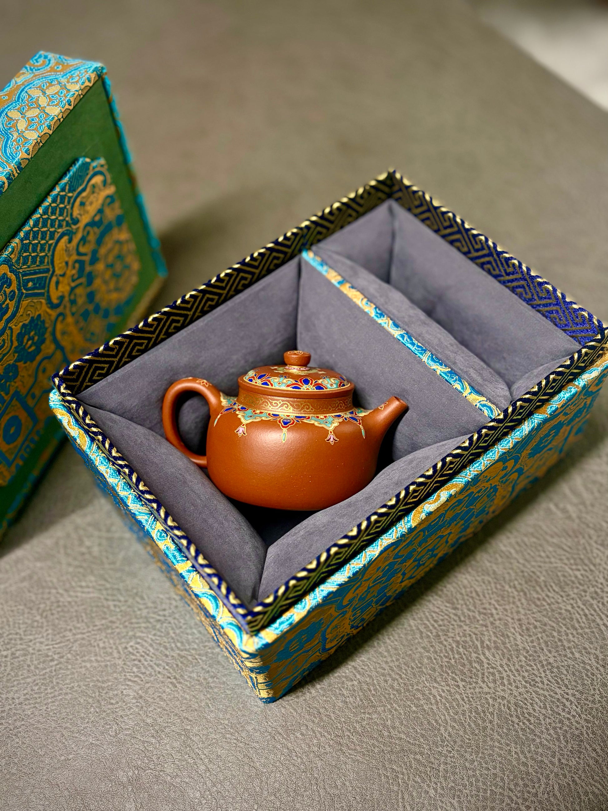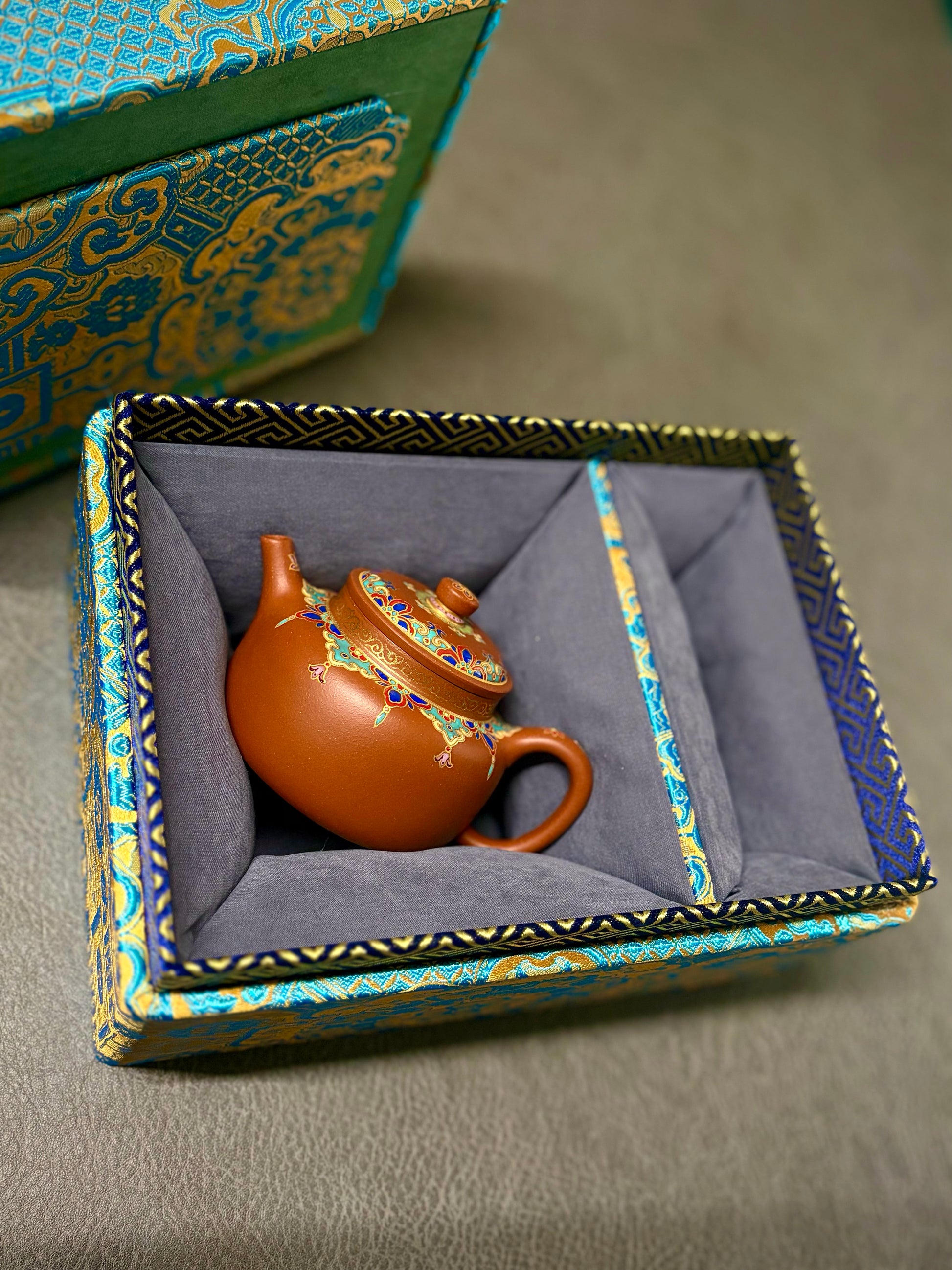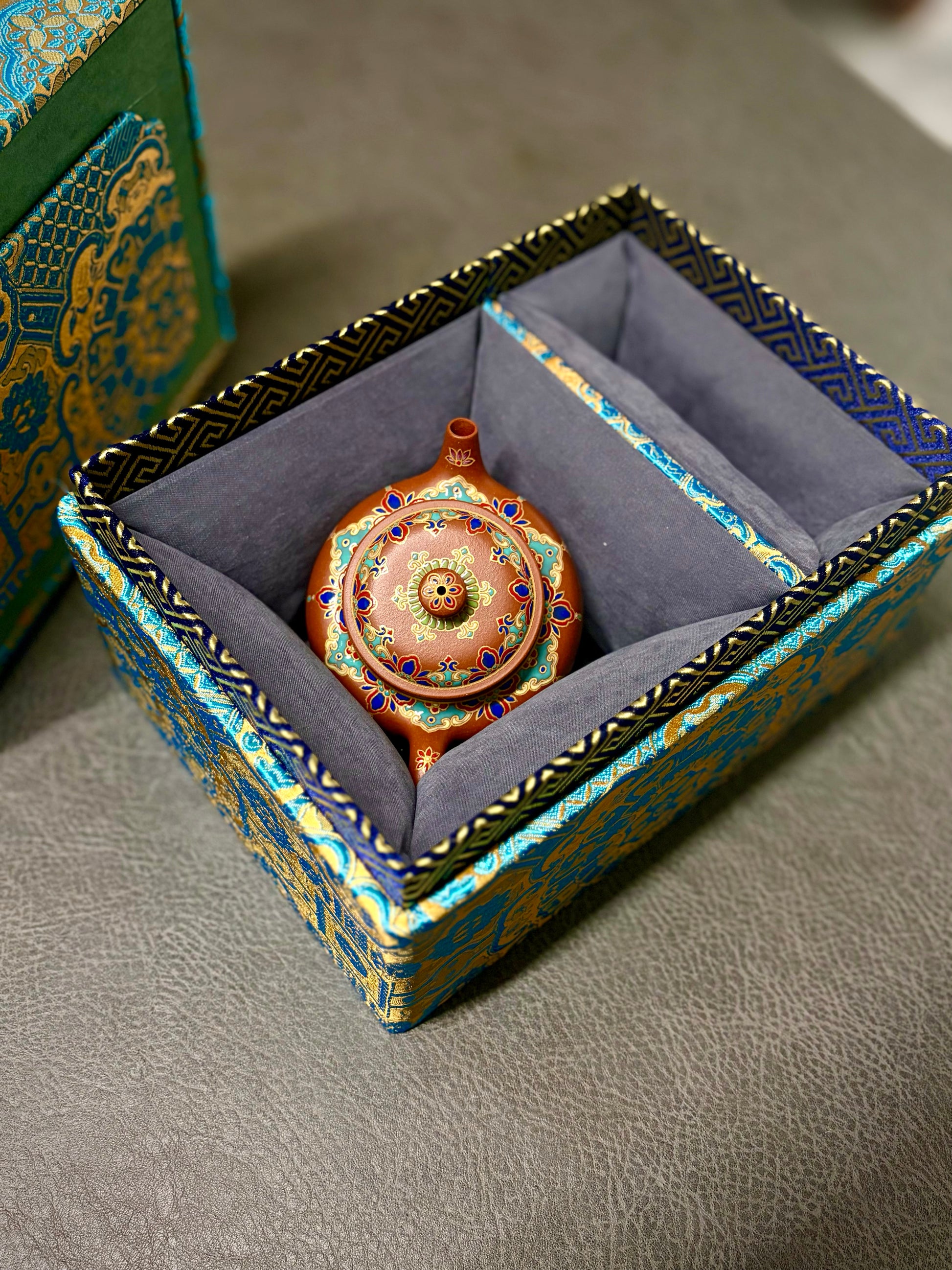 唐门德钟【言心】林颖老师摹唐彬杰先生原作,黄龙山小红泥全手工抟制,120cc内推孔。壶口拉高,鋬流根部与肩线自然结合,壶身手绘珐琅彩宫廷风格装饰,高级感满满